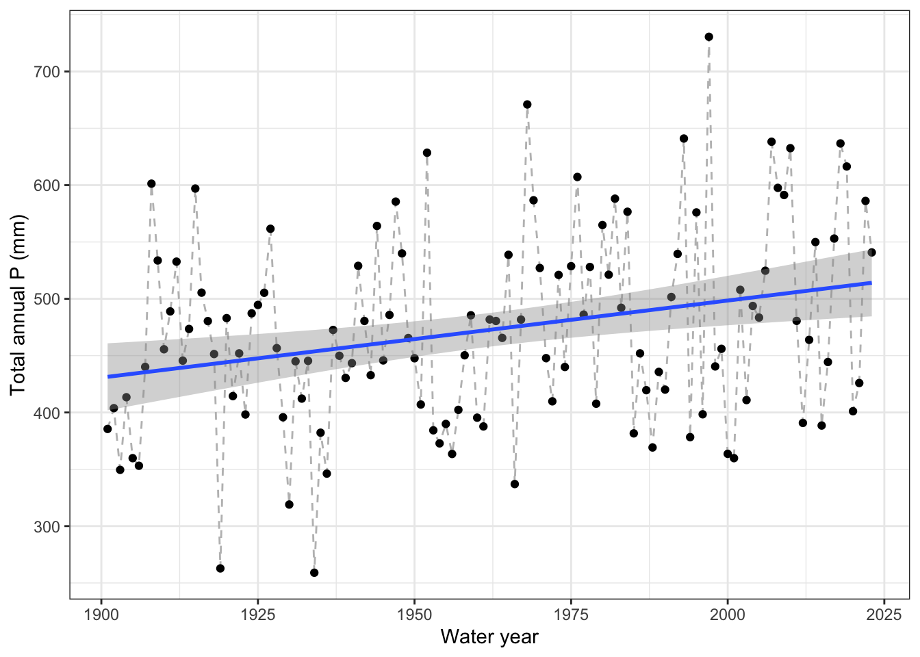 labs(y = "Total annual P (mm)", x = "Water year") +